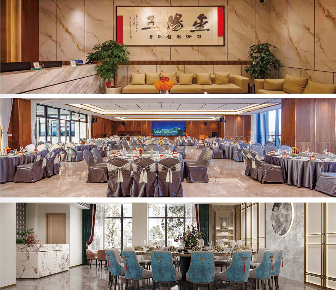 金阳王酒店拥有10间不同风格的新中式包厢, 配备舒适座椅、精致餐具和良好的就餐环境, 让您在享受美食的同时, 体验优质的服务。酒店设有多功能厅和二楼湖景宴会厅, 能容纳500位宾客。可满足不同规模的商务会议和社交团建的需求, 宽敞舒适的户外场地和先进的设施确保了活动的温馨和愉悦的氛围, 酒店还拥有1 0 间新中式客房和5 套具有时代风貌的江南别墅型民宿, 设计时尚典雅, 同时配备了现代元素的设施和家具, 可以让客人尽情享受舒适便捷的住宿体验和田园风光。
